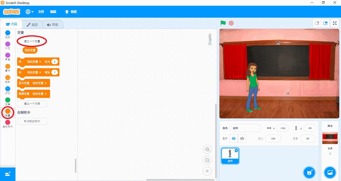 场景设置好后,我们就要做加法运算,首先要出现两个加数,并且这两个加数是随机出现的,换句话说,这两个加数是随时变化的。在这种情况下,我们就需要在Scratch中给我们的小程序建立【变量】。