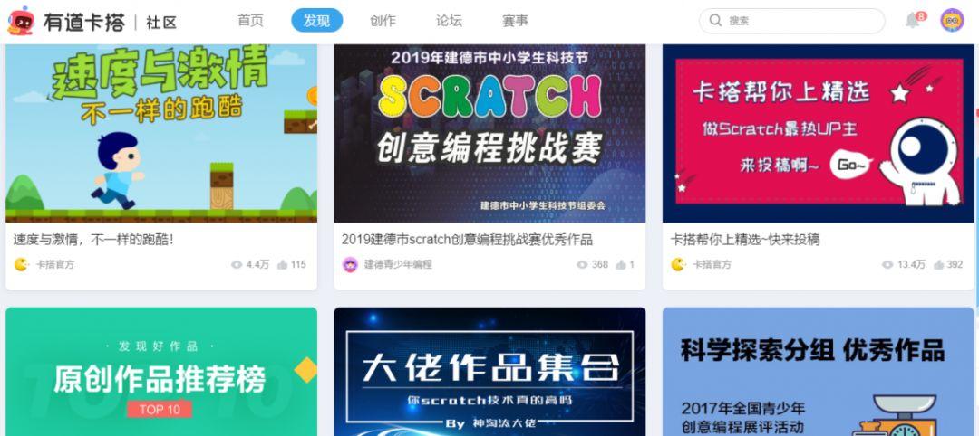 网易卡搭的界面比较可爱,整洁,比较吸引小孩子的目光,而且背后有来自浙大和网易的高手加持。这让这个社区的出身变得高贵,也用专业从业人员的技能来保证了课程和社区的专业程度。